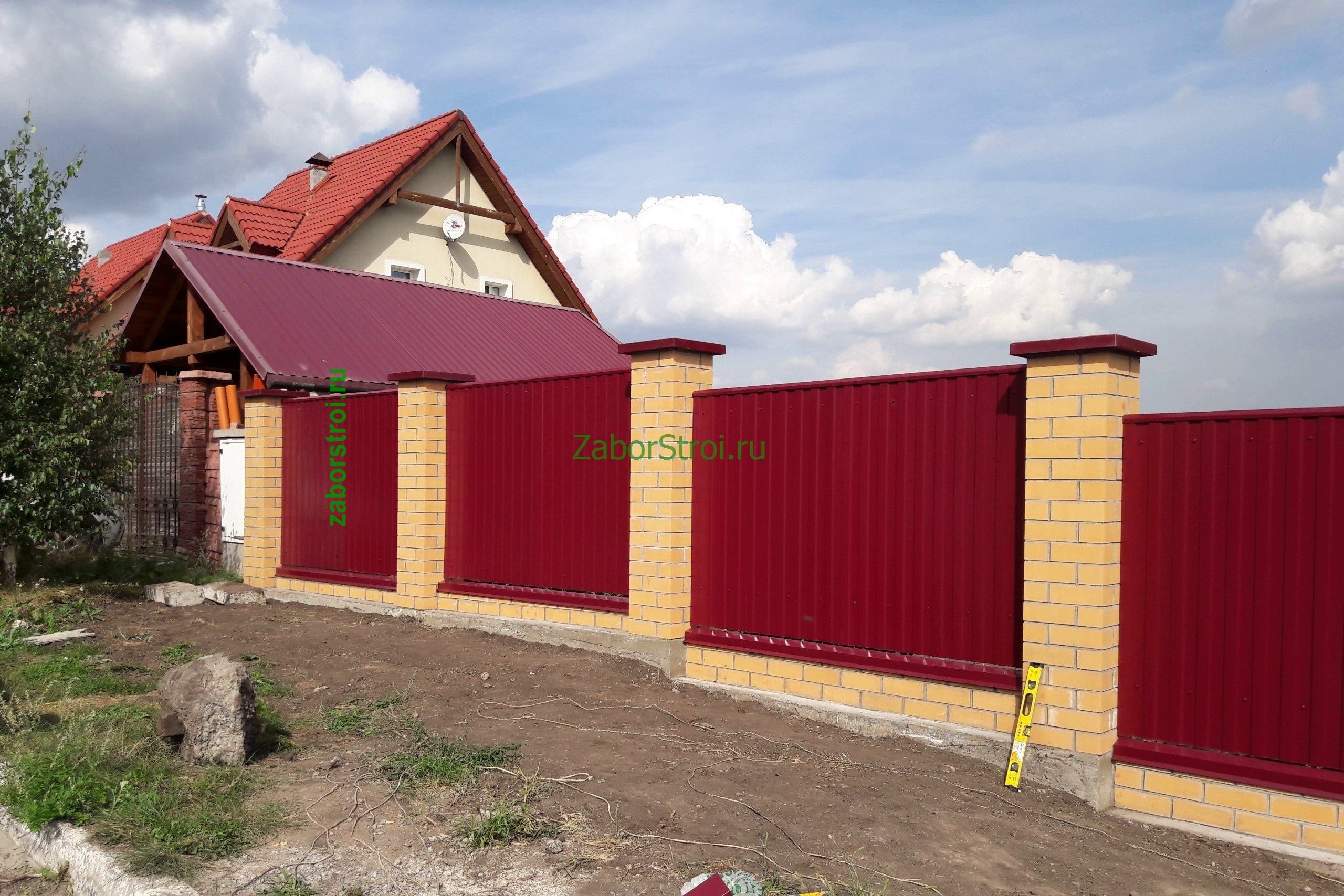 Заборы из профнастила с кирпичными столбами 15 метров